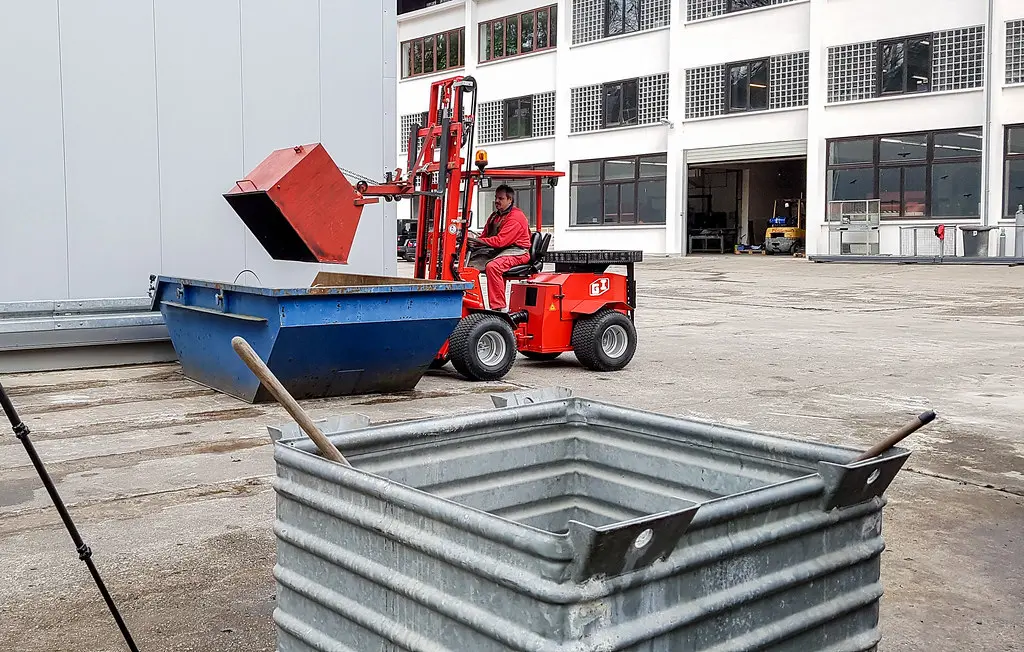 Der Einsatzbereich der selbstaufnehmenden GRÜNIG Anbau Kehrmaschinen umfasst grobförmigen Schmutz wie Holzklötze, Steine, Schlamm, Schrauben oder Schutt genauso wie feinen Staub, Sand, Glas-, Metall- oder Papierabfälle. Bequem vom Fahrersitz aus kann der aufgekehrte Abfall direkt in hohe Müllcontainer entleert werden. Bei der Reinigung von Flächen mit eingelassenen Schienen, wie sie auf Industriegeländen oft vorkommen, putzt ein schmaler Gleisbesen die Schienen und Zwischenräume gründlich sauber.