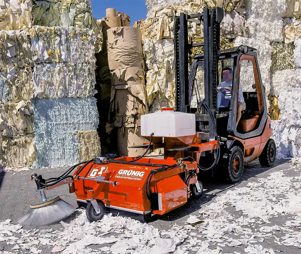 Sie sind die erste Wahl, wenn im Betrieb Trägerfahrzeuge vorhanden sind, die in ihren Stillstandszeiten optimal genutzt werden sollen. Denn eine Anbau-Kehrmaschinen der Marke GRÜNIG kann in Sekundenschnelle an viele gängige Trägerfahrzeuge wie beispielsweise Gabelstapler gekoppelt werden. Zeitaufwendige und komplizierte Umbauten? Mit einer GRÜNIG Kehrmaschine bestimmt nicht! Speziell für die Recyclingindustrie, bei der sowohl um die Aufnahme von lockerem, voluminösem Kehrgut wie etwa Papier als auch um schweres oder großstückiges Kehrgut wie Erde, Steine oder Holzstücke geht, empfiehlt sich zur Reinigung der Einsatz einer GRÜNIG Anbau-Kehrmaschine.