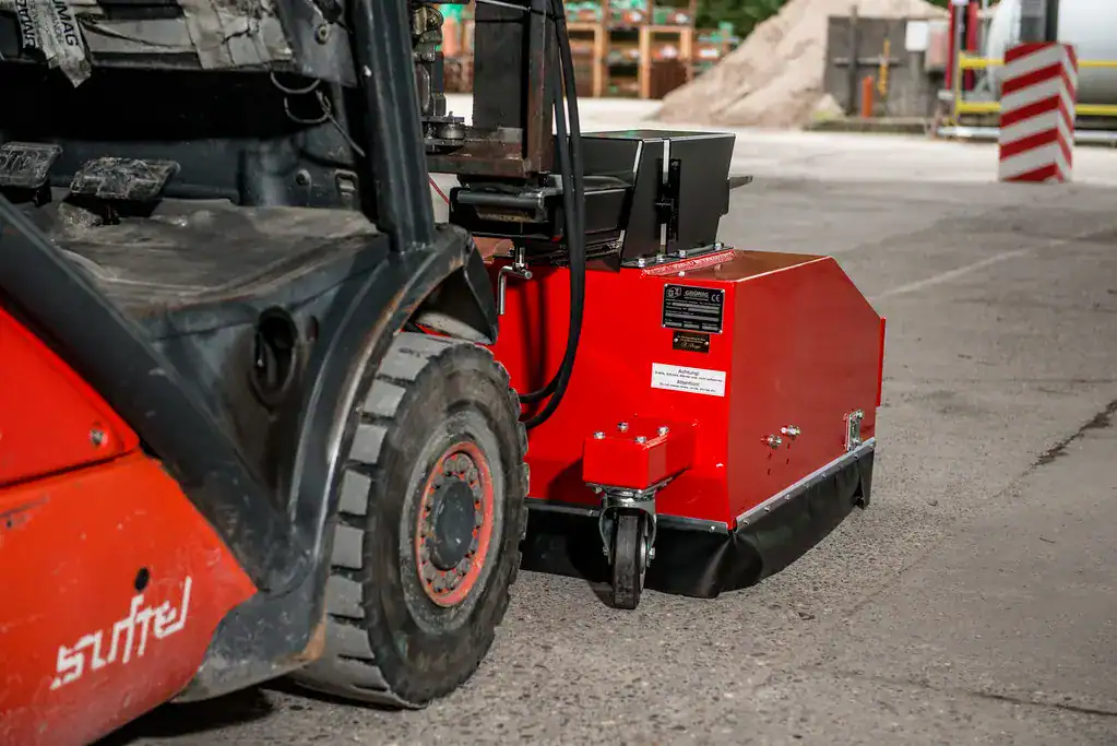 Mounting for hanging the sweeper in the forklift forks of a forklift or wheel loader, maximum fork cross-sectional dimensions 185 x 68 mm, with floating position, including fork clamping screw connection and safety bracket
