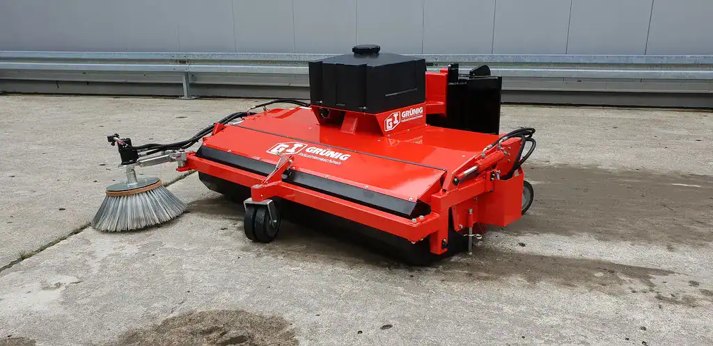 Anbau-Kehrmaschine mit hydraulisch hochklappbaren Schmutzbehälter