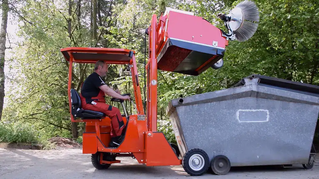 nahezu verdoppelter Füllgrad des Schmutzbehälters durch Überkopfkehrprinzip, extrem leistungsstark auch bei problematischem und großvolumigem Kehrgut wie Laub oder Papier, beinhaltet bereits die hydraulische Entleerung des Schmutzbehälters