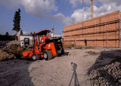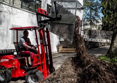 Mit dem entsprechenden Anbauaggregat ausgestattet, wird so aus dem geländegängigen Multitalent im Nu ein Kompaktstapler, eine Kehrmaschine, ein Grünflächenpflegegerät, ein Winterdienstfahrzeug, ein Bagger, eine Pflastersteinverlegemaschine oder noch einiges mehr.