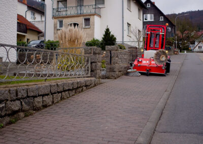 Mit der Pflasterverlegezange im Anbau, macht sich der knickgelenkte, allradgetriebene GRÜNIG Uni-Truck als flinker Helfer auch auf der Baustelle schnell unentbehrlich.